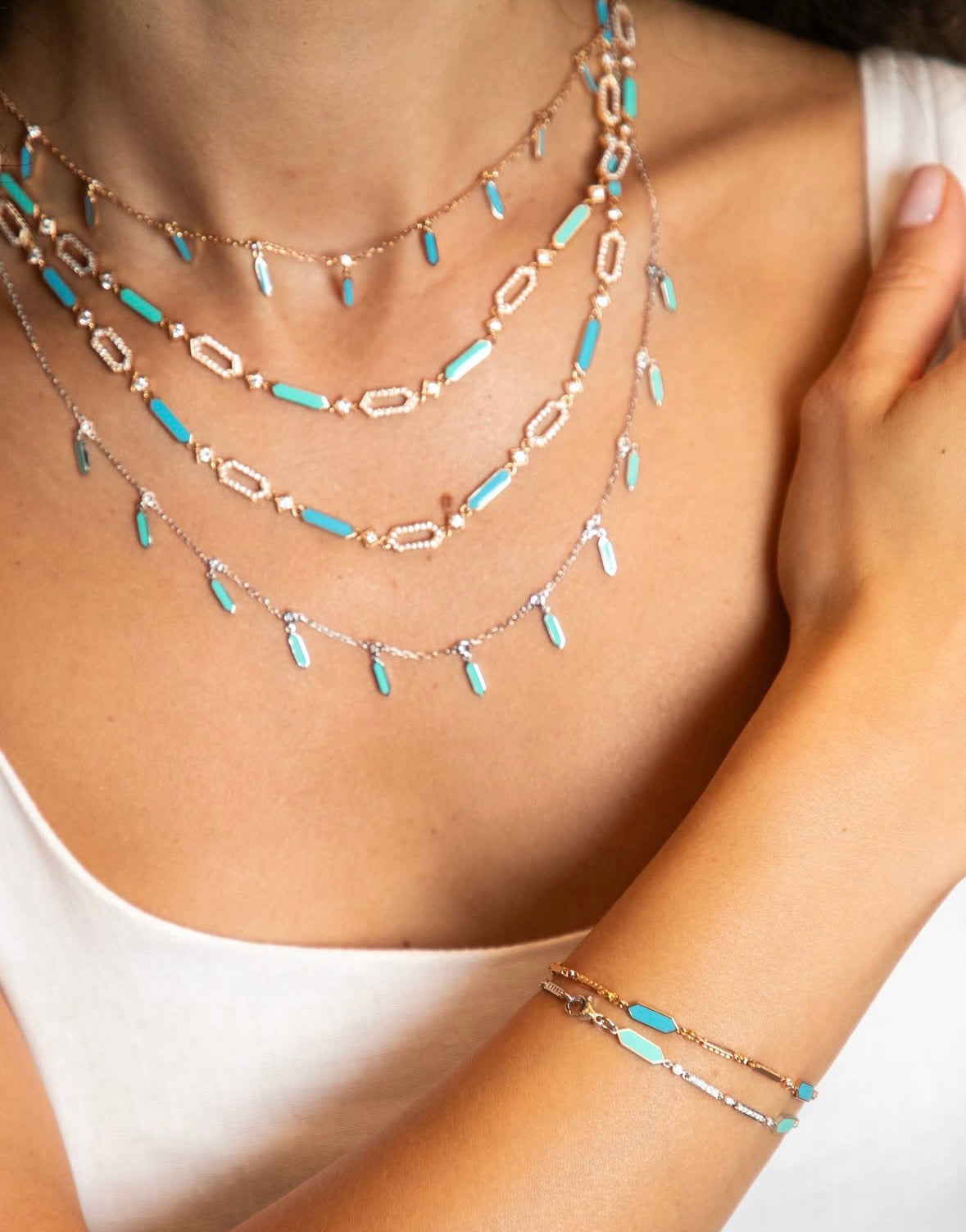 Wander the sun-drenched streets of Granada with this collection. Nano ceramic and vibrant enamel meet sparkling diamonds in delicate necklaces, perfect for layering and summer escapes. Capture the city's vibrant beauty in every shimmering detail.