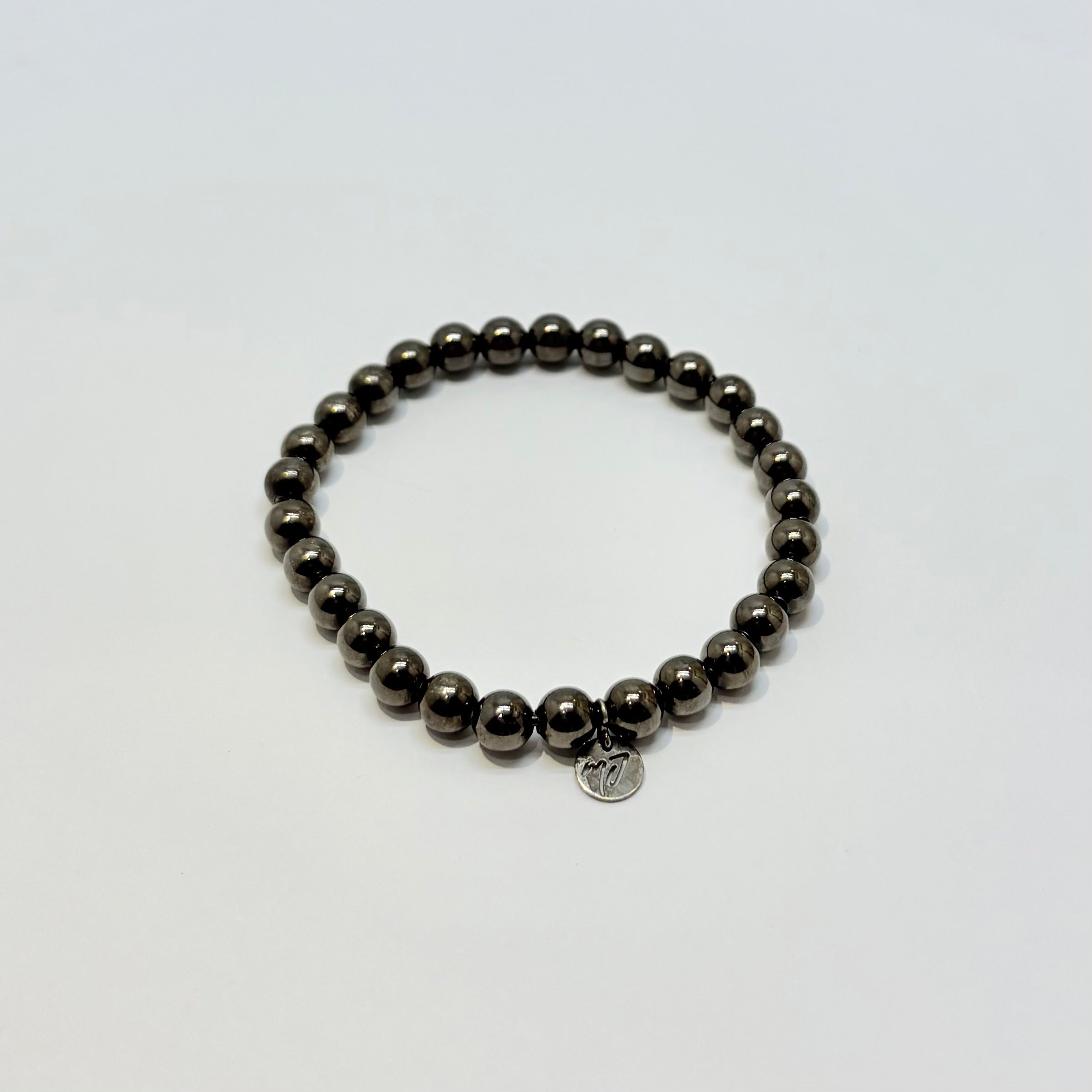 A bracelet designed to roll on and off the wrist with no visible clasp, plated in black gold (10.2g), and features a continuous strand of connected, round beads (6mm) in diameter.