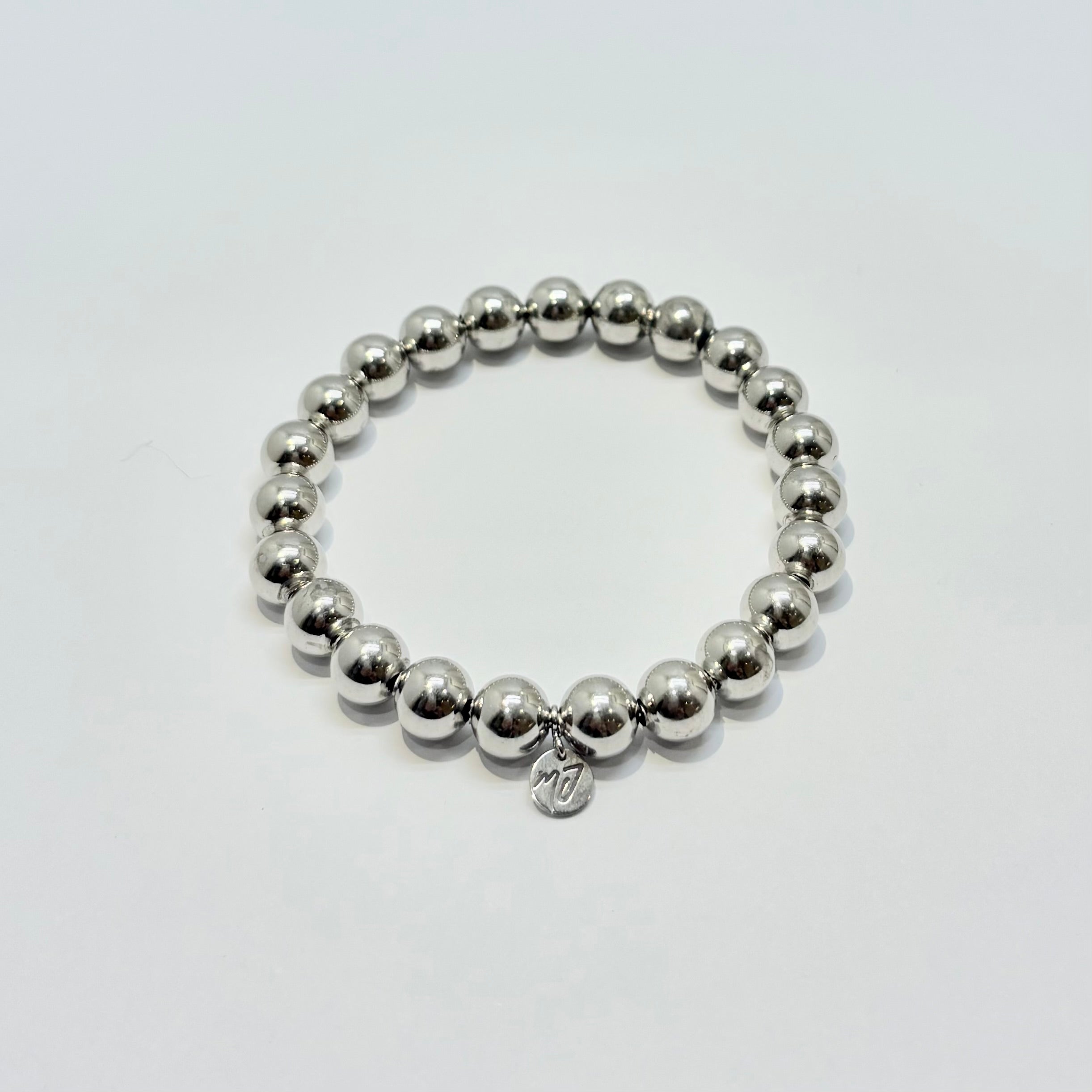 A bracelet designed to roll on and off the wrist with no visible clasp, plated in white gold, and features a continuous strand of connected, round beads (8mm) in diameter.