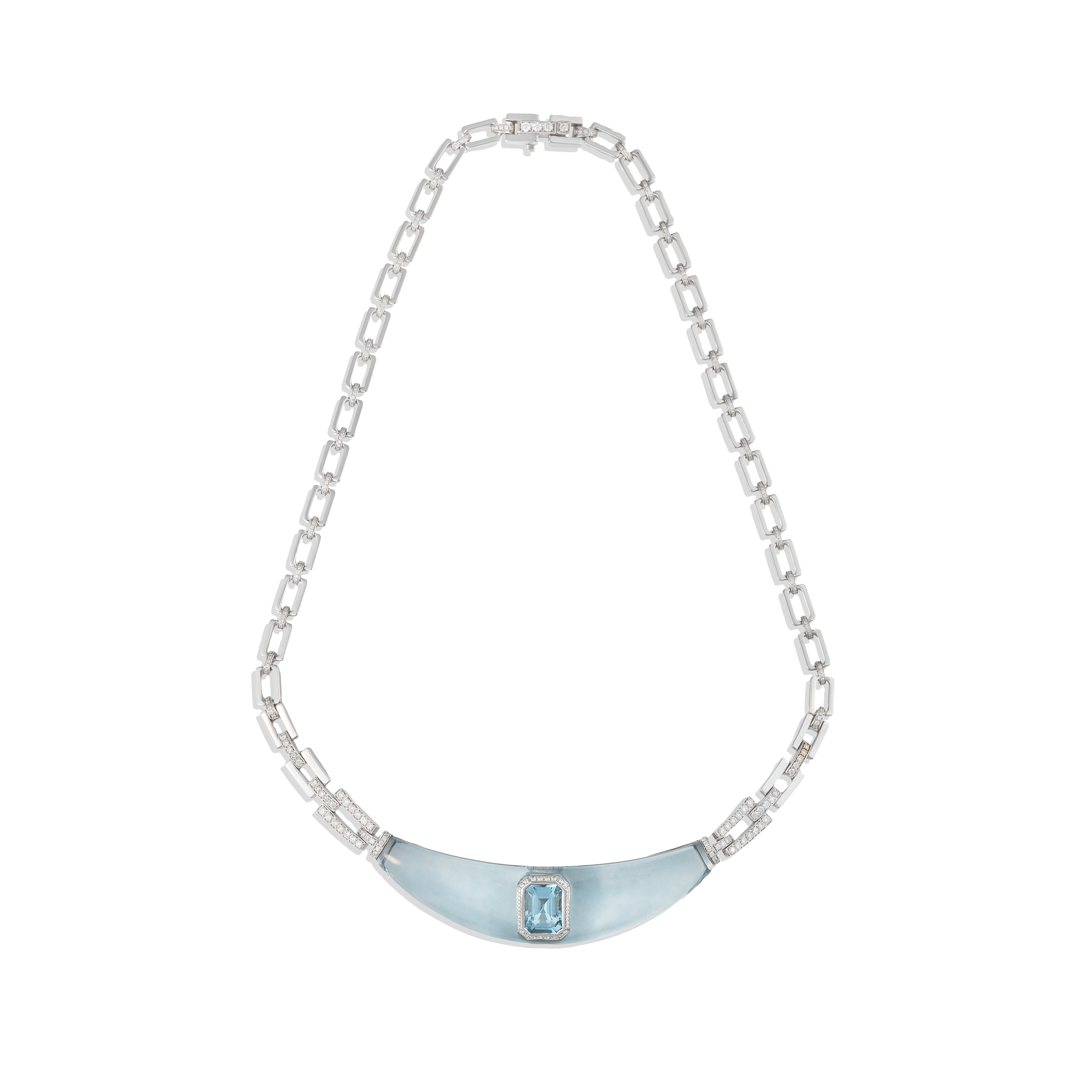 Round necklace in white gold (46.38g) set with diamonds (2.1ct) and aquamarine (0.69g) over a clear rock crystal panel (14.43g)
