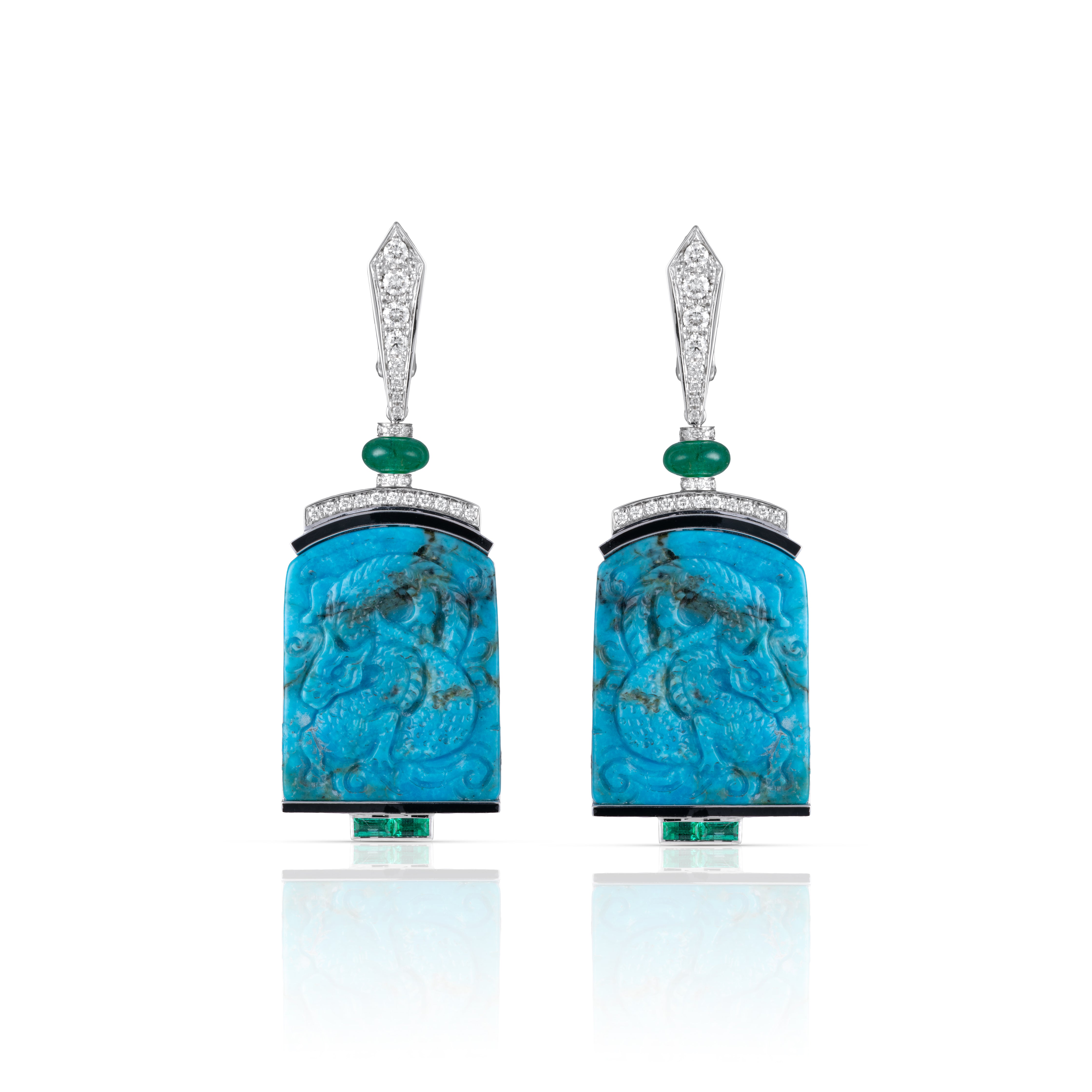 Earring in white gold (22.8g) set with diamonds (1.06ct), emeralds (3.51t) with carved turquoise (11.25g) and black enamel (0.05g)